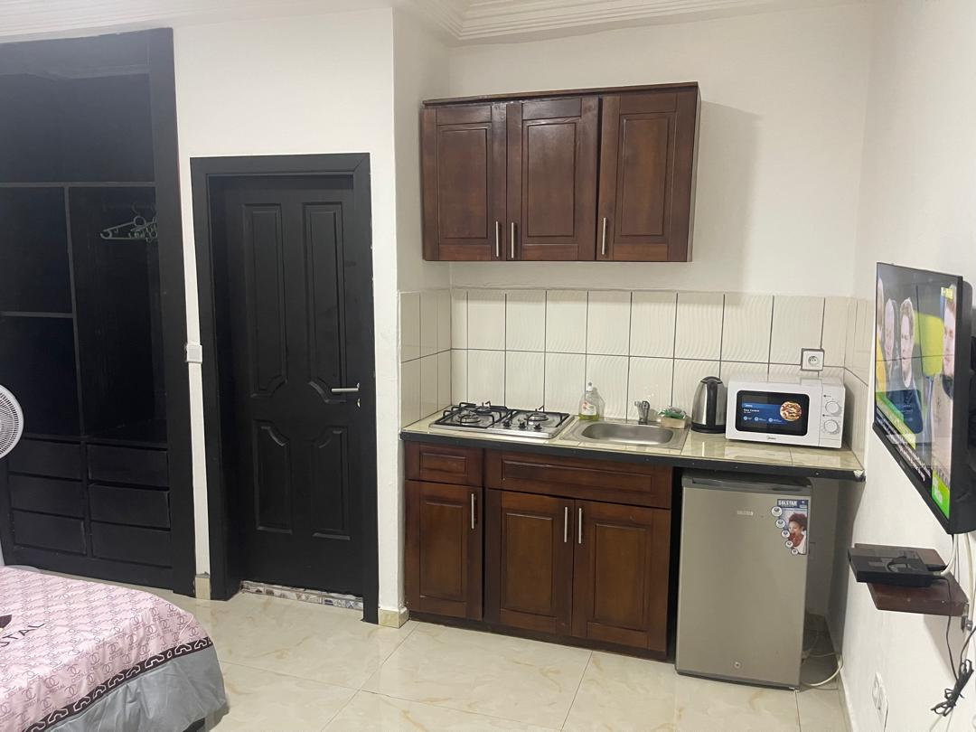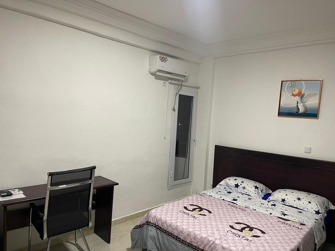 Chambre meublée à bonamoussadi ou studio 1 pièce meublé à la française d’un espace chambre aménagé d’un lit double, d’une smart tv avec abonnement canal+, d’un grand bureau.
