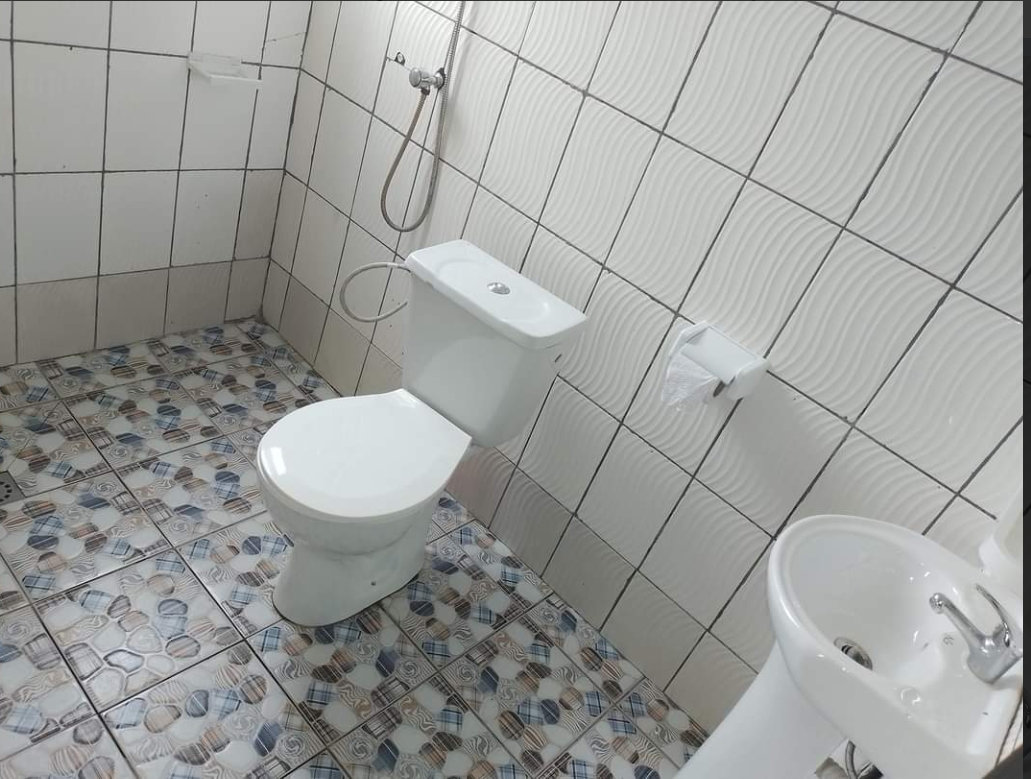 Une (1) salle de bain aménagée d’une douche, des wc, d’un lavabo, d’une serviette et savon de toilettes, d’un papier hygiénique, d’un porte-serviette, d’un porte-savon.