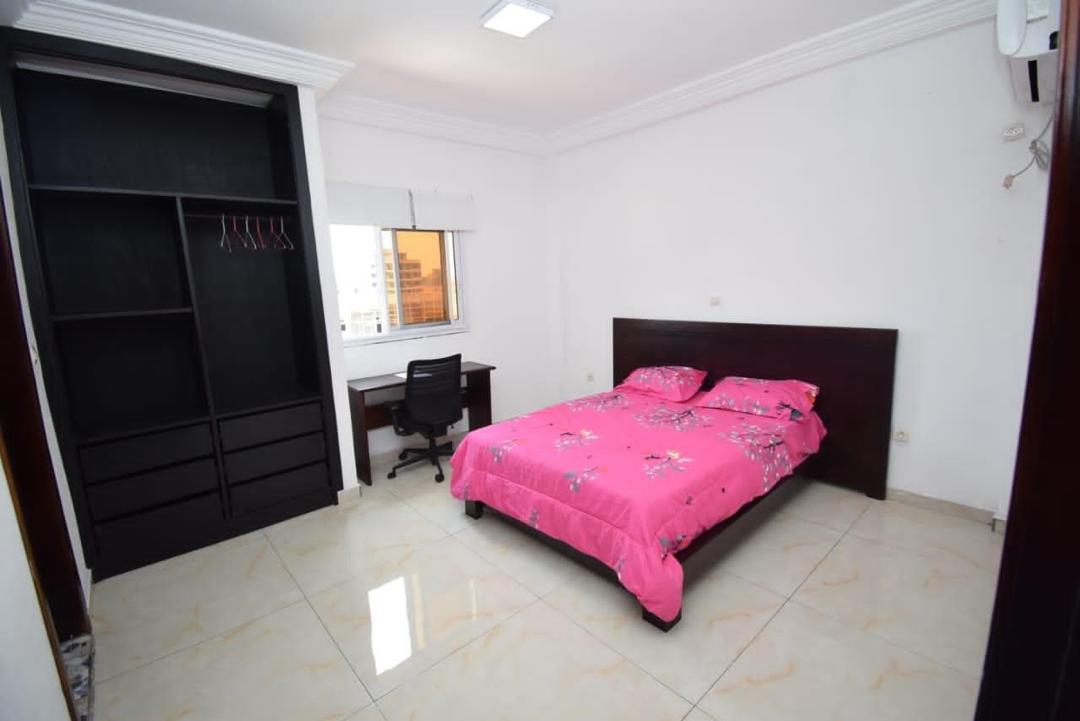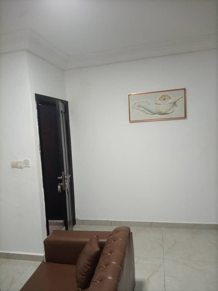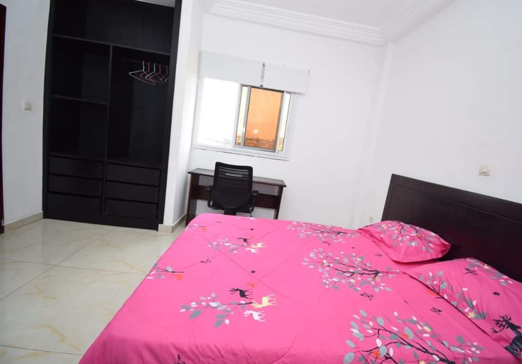 Chambre climatisée aménagée, d’un lit double avec des taies d’oreillers, d’un bureau de travail, d’un fer et planche à repasser…