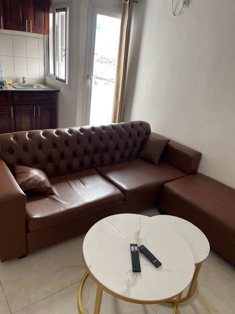 Cuisine équipée d’un refrigérateur, d’un plateau de cuisson à gaz, d’un micro-ondes, d’un moulinex, d’une bouilloire électrique, des ustensiles de cuisine, d’un plan de travail, des placards, d’un évier en inox 1 bac 1 égouttoir. etc…