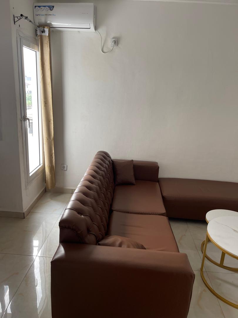 Salon climatisé aménagé, d’un canapé et d’un fauteuil en cuir, d’une table basse, d’une smart tv avec abonnement canal+…